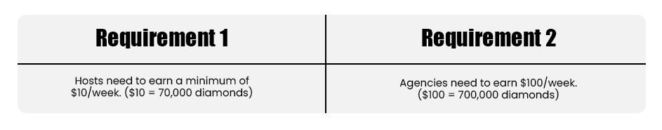 1. Withdrawable Hosts: Hosts who earn a minimum of 70,000 diamonds (approximately $10) will be counted under the agency.