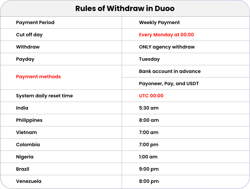 • The Duoo App operates on an agency-based withdrawal system.